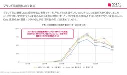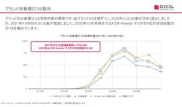 ブランド別の新規口コミ投稿件数の推移です(各ブランド50店舗ずつ)。2020年に口コミ数が大きく減少しましたが、2021年トヨタモビリティ東京のみ口コミ数が増加しました。2022年10月末時点ではトヨタモビリティ東京・Honda Cars 東京中央・関東マツダの3社がほぼ同数の口コミを集めています。