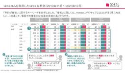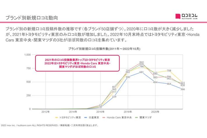 ・2022年10月末時点ではHonda Cars 東京中央、トヨタモビリティ東京、日産東京、関東マツダの3社がほぼ同数の口コミを集めており、日産東京は口コミ投稿数が比較的少ないこと