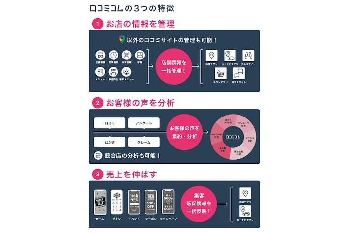 口コミコムは、Googleマップをはじめとした地図アプリや口コミサイトでの店舗情報を整理し一括更新できると同時に、お客様の口コミ分析、クーポンの配信まで行うことで、国内外の口コミサイトを”もっと”売上に変える「口コミサイトの一括管理ツール」です。また、導入頂いた店舗の口コミ数を増やすことにも貢献しておりますので、よりお客様の声を大切にする店舗運営が可能となります。