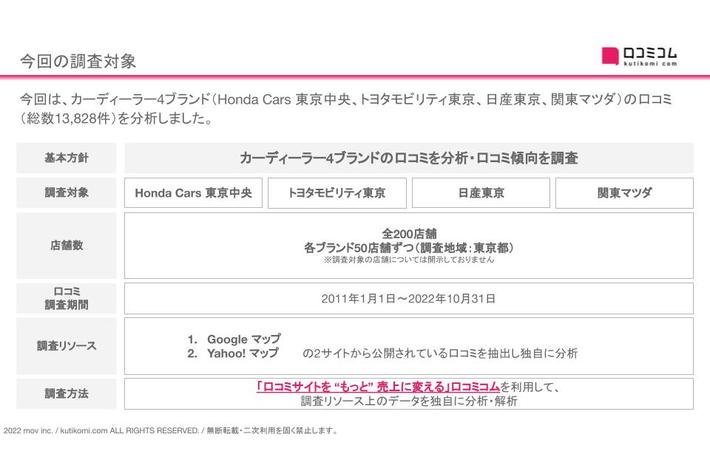 今回はカーディーラー4ブランド(Honda Cars 東京中央、トヨタモビリティ東京、日産東京、関東マツダ)50店舗ずつ合計200店舗に寄せられた13,828件の口コミを調査し、カーディーラー4ブランドの比較検証を行いました。