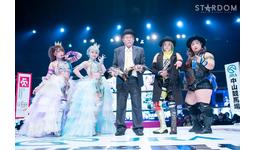 岩谷麻優選手、STARDOM・ロッシー小川EP、ブシロード・木谷高明社長(STARDOMオーナー)、ブシロードファイト・原田克彦社長