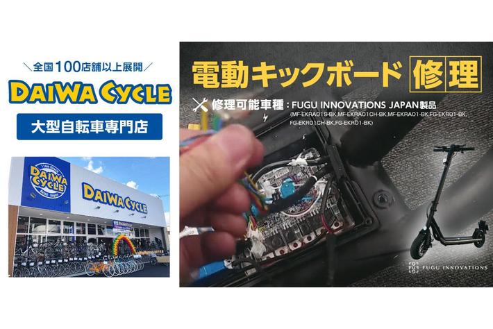 自転車の「新しいアタリマエ」を創る 自転車専門店 、 DAIWA CYCLE 株式会社(所在地: 大阪府吹田市 、代表取締役: 涌本宜央 )は、 2 023 年1月2日より FUGU INNOVATIONS JAPAN 製電動キックボードの正規修理店として 、 全国1 07 か所 (2 023 年1 月現在 ) にあるダイワサイクル ・ダイワサイクルSTYLE全 店で 持込修理サービスを 開始いたしま す 。