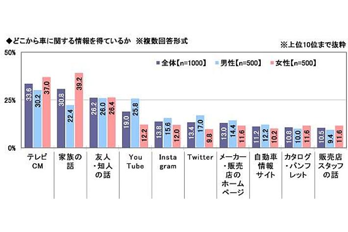 全回答者1,000名に、どこから車に関する情報を得ているか聞いたところ、「テレビCM」(33.6%)が最も高く、次いで、「家族の話」(30.8%)、「友人・知人の話」(26.2%)、「YouTube」(19.0%)、「Instagram」(13.8%)、「Twitter」(13.4%)となりました。テレビCMや身近な人からの話以外に、SNSが情報源になっている方も多いようです。