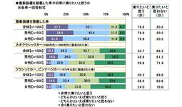 全回答者1,000名に、≪最新装備を搭載した車≫にどのくらい乗りたいと思うか聞いたところ、「非常に乗りたいと思う」は27.7%、「どちらかといえば乗りたいと思う」は52.1%で、合計した『乗りたいと思う』は79.8%、「全く乗りたいと思わない」は8.7%、「どちらかといえば乗りたいと思わない」は11.5%で、合計した『乗りたいと思わない』は20.2%となりました。自動運転や安全装置、そのほか快適な運転をサポートする機能・装備など、最新の装備を備えた車に乗ってみたいと思う方は多いようです。