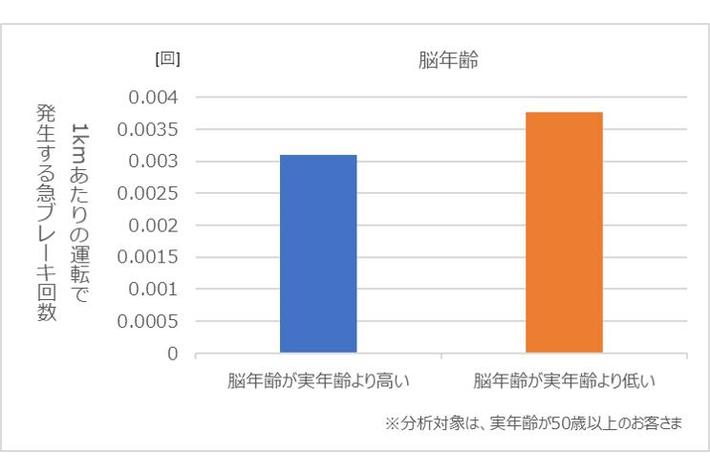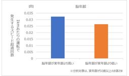 脳年齢が実年齢より高い方は、急ブレーキの発生回数は少ない傾向となる一方で、スピード超過の発生回数が多い傾向にありました(図2・図3)。