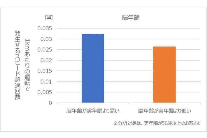 今般、「のうKNOW」を実施いただいた50歳以上のお客さまの脳の健康度と&eアプリから得られた運転データの関係を分析したところ、交差点付近における「スピード超過回数」や「急加速回数」などの危険挙動発生数の多寡が脳の健康度別に異なることが分かりました。