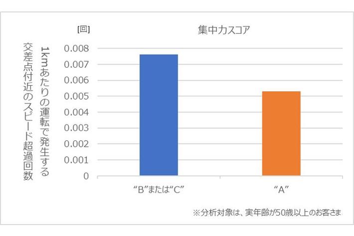 集中力スコアが“B”または”C”の方は交差点付近でスピード超過の発生回数が多い傾向にありました(図4)。