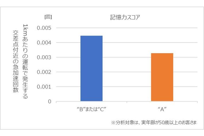 記憶力スコアが“B”または”C”の方は交差点付近で急加速の発生回数が多い傾向にありました(図5)。