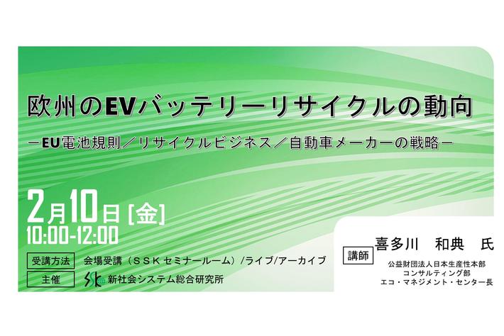 「欧州のEVバッテリーリサイクルの動向」と題して公益財団法人日本生産性本部 コンサルティング部 エコ・マネジメント・センター長 喜多川 和典氏のセミナーを2023年2月10日(金)に開催!!