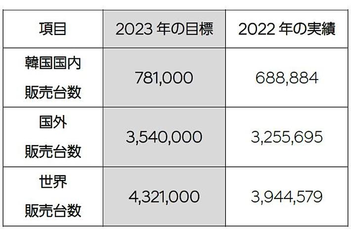 2023年は、地域ごとの事業戦略を最適化することで、ラグジュアリーブランドのGenesisを含め、全世界で4,320,000台の販売を目指します。国外市場で3,540,000台、韓国国内で781,000台を販売する考えです。