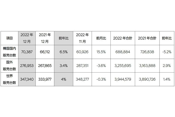 2022年12月の月間世界販売台数は、合計347,340台(国外市場で276,953台、韓国市場で70,387台)でした。