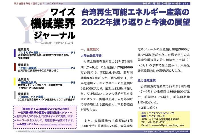 ワイズコンサルティング グループ(本社:中華民国台北市、代表取締役:吉本康志)は台湾機械業界専門誌「ワイズ機械業界ジャーナル」の2023年1月第3週号を発行しました。今週号では、エネルギー業界、手動工具業界、精密ロックナット世界3位のYINSH PRECISIONと自動車・バイク業界を紹介します。