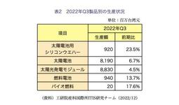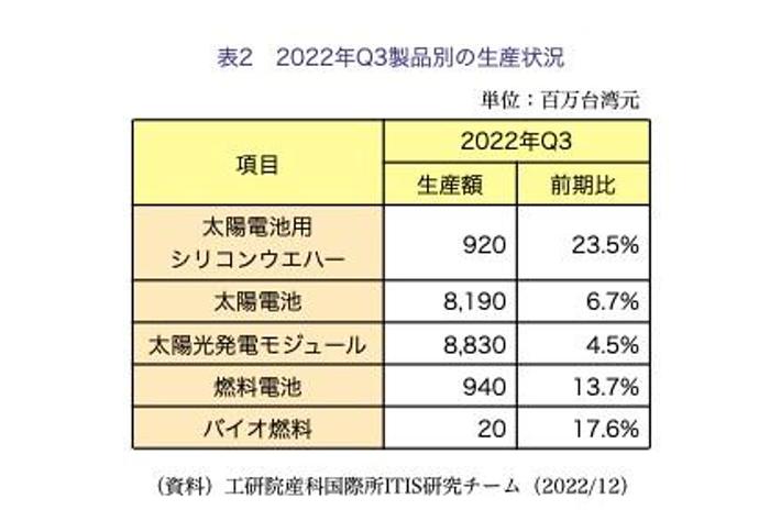 台湾太陽光発電産業の22年第3四半期(7~9月)の生産額は179億6000万台湾元で、前期比6.4%増、前年同期比8.8%減だった。製品別では、太陽電池用シリコンウエハーの生産額は9億2000万元で、前期比23.5%増加した。▽多結晶シリコンの供給不足を受けたオファー価格の上昇、▽海外向けの需要増による出荷拡大、▽為替差益が寄与した。