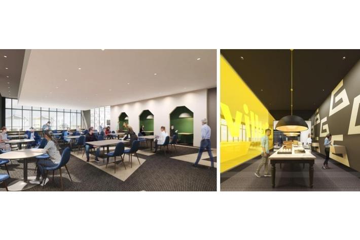 ゆっくりおくつろぎいただけるカフェコーナー(右):商談スペースとは別に、カフェコーナーを設けております。多くのお客様にご利用いただけるよう様々な種類を取り揃えたお飲物は、商談ルームにもお持ち込みいただけます。