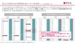 アップルにおける口コミで多用されるキーワードとその使用回数を年別に比較しました。2021年から2022年にかけてキーワードの使用回数が急増していることが分かります。2022年には「 接客」や「 迅速」といったワードの ポジティブな使用回数が伸びており、顧客がどういった面に満足感を示しているのかがよく分かる結果となりました。