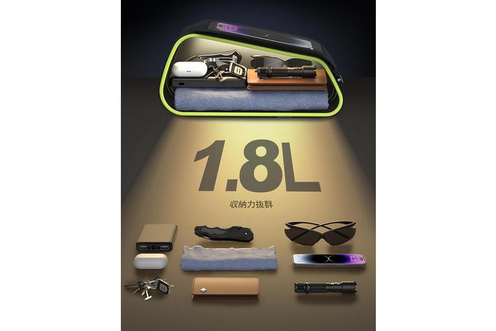 Lamiallのトップチューブバッグは1.8リットルの大容量。スマートフォンだけでなく、補助食、修理キット、携帯工具、CO2ボンベセット、予備チューブ、タイヤレバーなども収納できるため、中・長距離ライドや観光ライドにも最適です。また、バッグの内側にはメッシュポケットが付いています。鍵やワイヤレスイヤホンケースなどの小物を入れられるため、バッグ内の視認性が高まるでしょう。