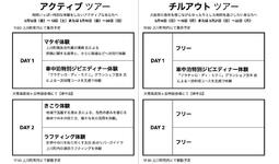 アクティブツアーは一連のアクティビティ体験付き。チルアウトツアーは食事以外は自由行動。