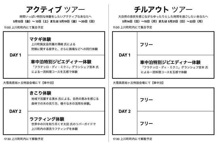 これまでの取り組みで得た知見・調査結果を活かし、より差別化され付加価値の高い魅力的なツアー内容となっております。具体的には、初心者・家族連れでもそのまま移動し車中泊ができる点、時間いっぱい特別な体験をしたいアクティブ派と大自然の息吹を感じながらチルアウトしたいゆったり派などのニーズ別設定をしている点などです。地元で活躍されるガイドや一流シェフ、そして、キャラバンとともに、北海道上川町ならでは魅力溢れる体験モニターツアーへのご応募をお待ちしております。