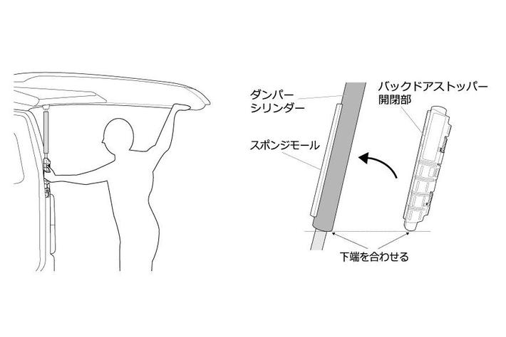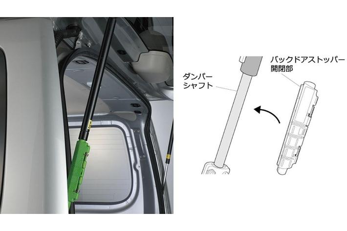 バックドアを開けたまま荷物の積み込みや荷室で作業したいときなど、積載物で重くなったバックドアが下がらないように支える、「バックドアストッパー」を付属いたしました(下写真)。