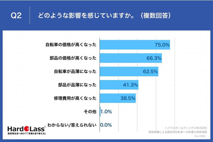 Q1で「非常に感じている」「やや感じている」と回答した方に、 「Q2.どのような影響を感じていますか。(複数回答)」(n=104)と質問したところ、 「自転車の価格が高くなった」が75.0%、「部品の価格が高くなった」が66.3%、「自転車が品薄になった」が62.5%という回答となりました。