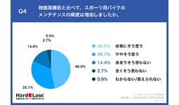 「Q4.物価高騰前と比べて、スポーツ用バイクのメンテナンスの頻度は増加しましたか。」(n=111)と質問したところ、 「非常にそう思う」が46.9%、「ややそう思う」が35.1%という回答となりました。