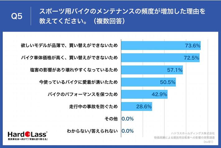 Q4で「非常にそう思う」「ややそう思う」と回答した方に、 「Q5.スポーツ用バイクのメンテナンスの頻度が増加した理由を教えてください。(複数回答)」(n=91)と質問したところ、 「欲しいモデルが品薄で、買い替えができないため」が73.6%、「バイク車体価格が高く、買い替えができないため」が72.5%、「塩害の影響があり壊れやすくなっているため」が57.1%という回答となりました。