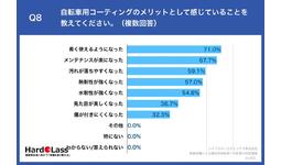 Q7で「はい」と回答した方に、 「Q8.自転車用コーティングのメリットとして感じていることを教えてください。(複数回答)」(n=93)と質問したところ、 「長く使えるようになった」が71.0%、「メンテナンスが楽になった」が67.7%、「汚れが落ちやすくなった」が59.1%という回答となりました。