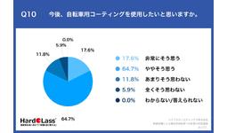Q7で「いいえ」と回答した方に、 「Q10.今後、自転車用コーティングを使用したいと思いますか。」(n=17)と質問したところ、 「非常にそう思う」が17.6%、「ややそう思う」が64.7%という回答となりました。