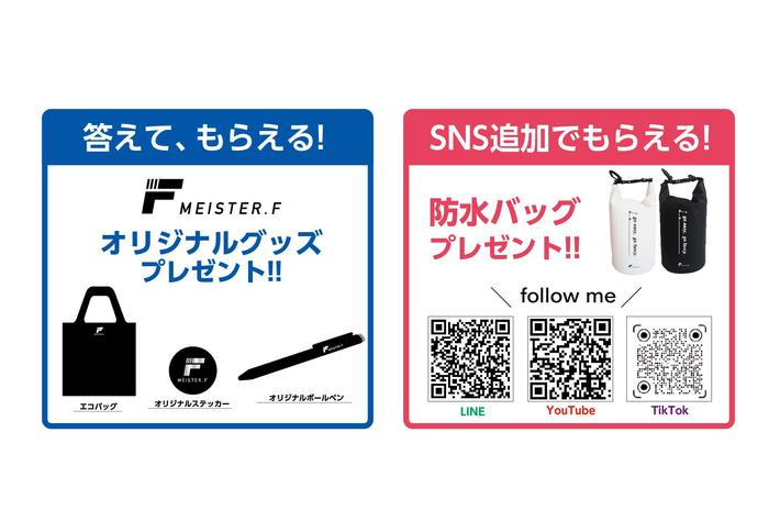 試乗後のアンケート にお答えいただいたお客様には、MEISTER.Fオリジナルのエコバッグやフリクションペンのプレゼントを行います。また、MESTER.F公式SNS(TikTok、YouTube、LINE)の追加で黒もしくは白からお好きなカラーの防水バックをプレゼントいたします。