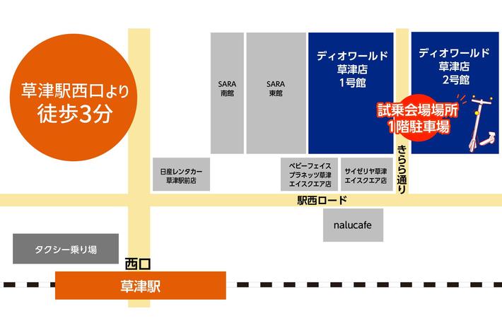 試乗の受付は、「ディオワールド2号館1階駐車場」にて行います。試乗同意書へのご署名と、ヘルメットの着用をお願い致します。 また、感染症対策として検温・消毒、ヘルメットを着用時はメッシュキャップとビニール手袋着用のご協力をお願い致します。なお、試乗の待機列の定員を超えた場合は、整理券を配布致します。予めご了承ください。ご試乗頂いた電動キックボードと電動バランスボードは、1階「ディオワールド2号館サイクルセンター」にてご購入いただけます。