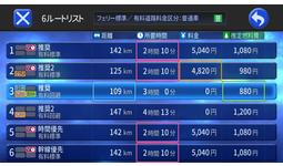 有料優先/有料回避(一般優先)/時間優先/幹線優先(高速道路や国道など走行しやすい道)などを考慮した6ルートから、好みに合わせてルートを選択できます。