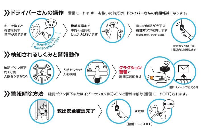 実証実験の結果から、「送迎をしていない、給油や掃除・整備等でもエンジンを停止する度に、スイッチを押さなければならず、とても負担だ」という多くのご意見から、キー抜き取り連動式を採用しました。キーを抜いて、車内安全確認が完了したら、「確認ボタン」を押すだけの簡単な操作で作動します。