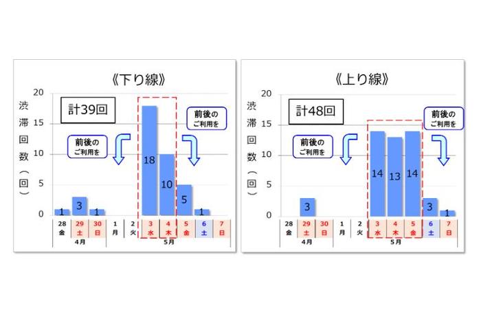 ◆ NEXCO西日本管内の渋滞回数は、 下り線では5月3日(水曜)~4日(木曜)、上り線では5月3日(水曜)~