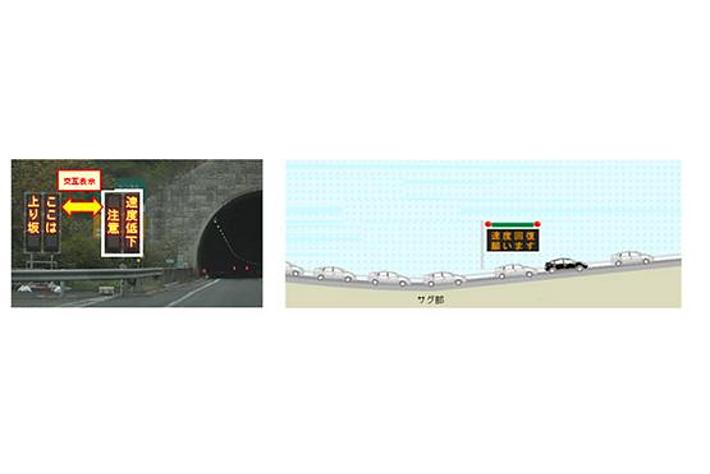 (上り坂などの渋滞発生箇所付近において、LED標識で「速度低下注意」や「速度回復願います」を表示)