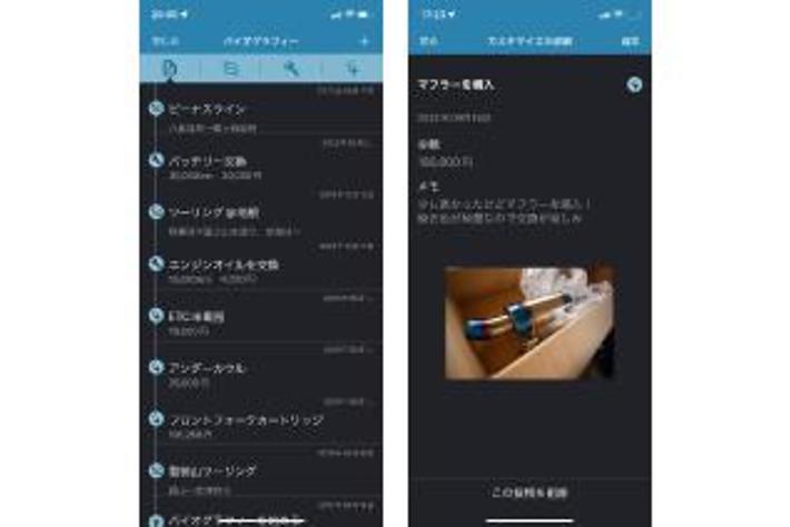 「カスタマイズ」では、カスタマイズ内容のメモや撮影写真を、「メンテナンス」では、金額や内容のメモなどを記録できます。