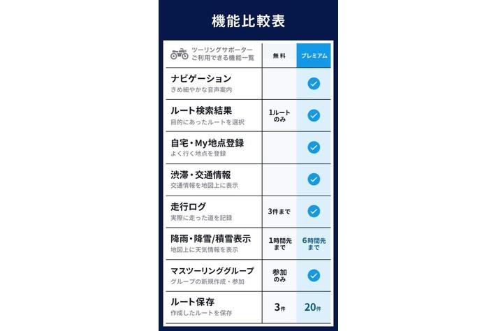 「ツーリングサポーター」のプレミアムコースでは、排気量別のルート検索や、景色の良い道を優先したナビゲーション、ライダー同士で位置場所を共有できるマスツーリング機能、無制限の走行ログ保存機能なども使えます。音声ナビゲーション機能では、右左折する交差点名称、急カーブ注意喚起、天候案内など、きめ細やかな音声案内で、ツーリングを便利にサポートします。