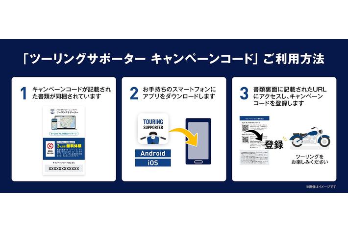 B+COM PLAY キャンペーンキットに同梱されている書類に「ツーリングサポーター」プレミアムコースのキャンペーンコードが記載されているので、お手持ちのスマートフォンにアプリをダウンロードしてご利用ください。