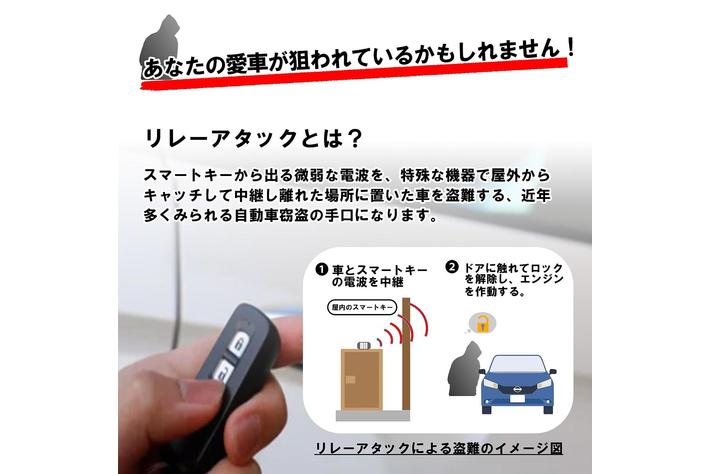 玄関や窓際等に置いた自動車のスマートキーから出る微弱な電波を、特殊な機器で屋外からキャッチ増幅&中継し、 駐車場などに停めた車両をわずか数十秒で盗難する、海外や日本でも多くみられる自動車窃盗の手口の一つとなります。