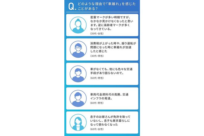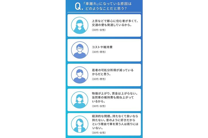 「維持費の問題」や「物価は上がったが賃金は上がらないため」といった理由が多く挙げられていました。ほかにも「車を持たずとも生活に困らないくらいには交通の便が発達しているから」といった意見もありました。