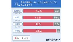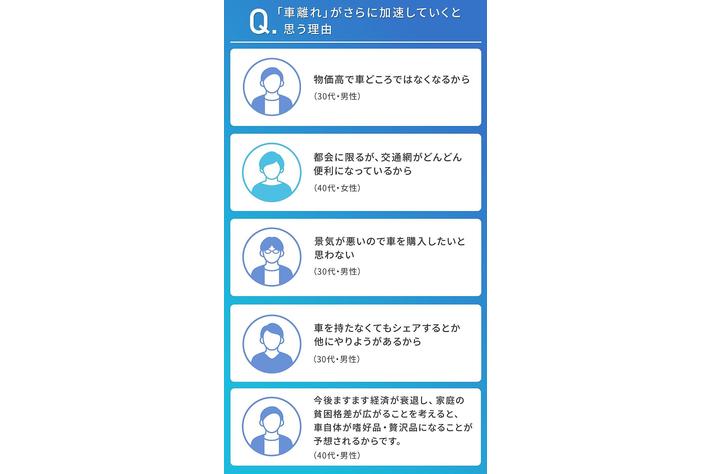 さらに60代以上では98.4%と、ほとんどの方が今後「車離れ」はさらに加速していくと「思う」と回答しました。その理由は「都心では交通の便が発達している」や「物価の高騰」「経済の衰退」などといった理由が挙げられていました。
