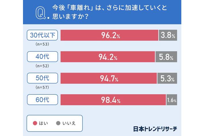 ■60代の98.4%が、今後車離れはさらに加速していくと「思う」