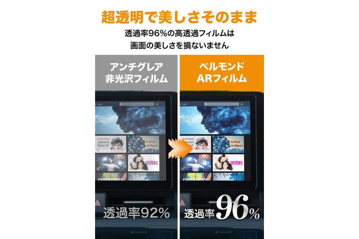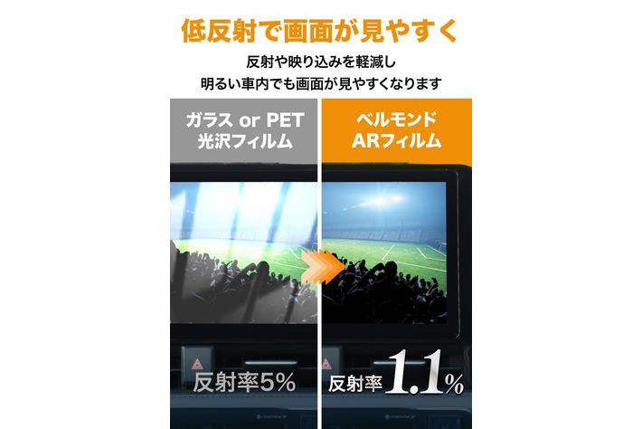 反射率1.1%の低反射フィルムなので、反射や映り込みを軽減し、明るい車内でも画面が見やすくなります。