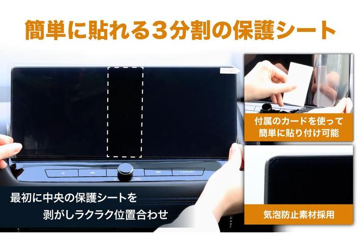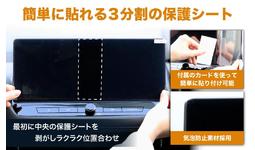 保護シートを「3分割」にすることにより、大きなナビ画面でも位置合わせがしやすく、簡単に貼り付けが可能です。また、フィルムの粘着面には特殊シリコン素材を採用。これによりフィルムは自己吸着し、気泡は入りづらく抜けやすくなります。※画像は別車種のものです。