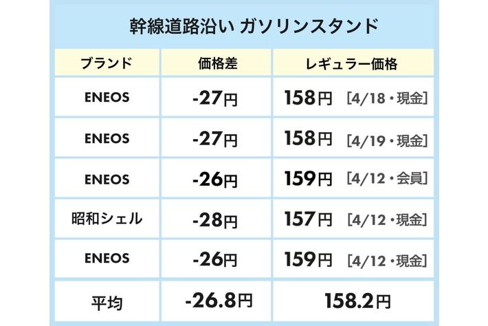 幹線道路沿いにあるガソリンスタンドは、レギュラー価格が平均158.2円となり、