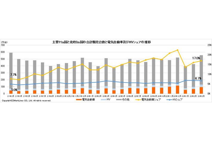 マークラインズ株式会社(本社:東京都千代田区、代表取締役社長:酒井 誠、http://www.marklines.com/) は、電気自動車の世界販売の約90%をカバーする主要14カ国を対象にグローバル市場における電気自動車の台数情報及び販売動向を分析した2023年3月の電気自動車(BEV/PHV/FCV)販売月報(商用車を除く、推計値を含む)を掲載しました。