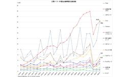 全パワートレインに対する電気自動車のシェアは17.0%となり、前月から1ポイント上昇した。HVは0.1ポイント減少し、6.7%のシェアとなった。電気自動車の販売台数も少しずつではあるが、昨年末の水準に戻ってきており、今後の伸びに注目していきたい。