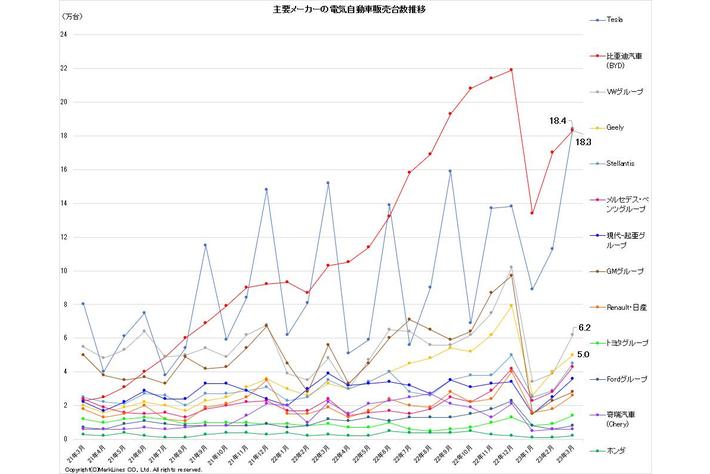 3月は、中国での販売台数を大幅に増やしたTeslaがBYDを抜き2022年6月以来の首位。2位は0.1万台の差でBYD、3位にVWグループが続いている。ここでもTeslaの大幅な値下げの影響力が現れる形となった。