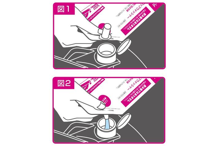 3)注ぎ口をウォッシャータンクに向け、●印から指をゆっくりと離して注ぎ入れてください。液がこぼれないように注意してください。(図2)