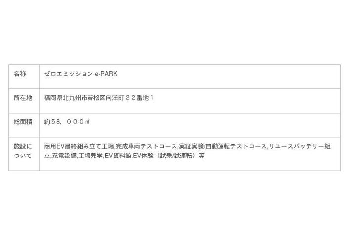 施設について:商用EV最終組み立て工場,完成車両テストコース,実証実験/自動運転テストコース,リユースバッテリー組立,充電設備,工場見学,EV資料館,EV体験(試乗/試運転)等