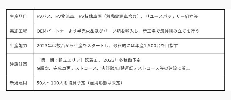 まずは、2023年秋に組み立て工場・検査棟の完成を目指し、順次設備を拡大し、国産EVバスの展開を目指して参ります。